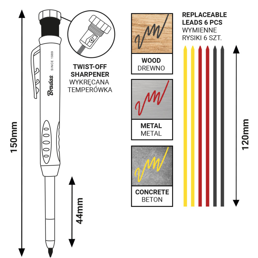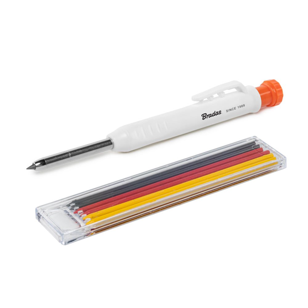 Практичний і міцний автоматичний олівець для столярних робіт довжиною 14,5 см — незамінний інструмент у роботі кожного професіонала. Завдяки міцній конструкції з АБС-пластику та металу, а також вбудованій точильці ви завжди готові до точного маркування на різних поверхнях. Ідеально підходить для отворів, щілин і кутів, куди не дотягнеться звичайний олівець.Технічні характеристики