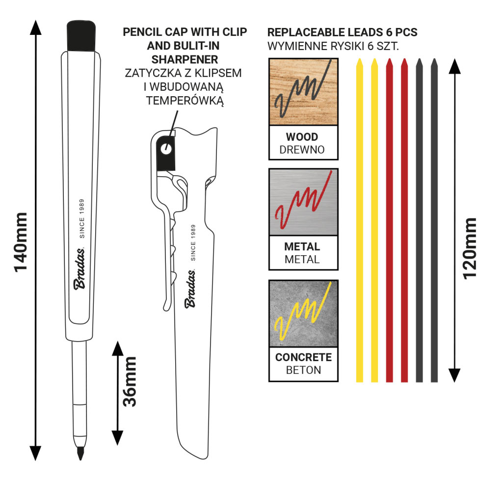Практичний і міцний автоматичний столярний олівець з чохлом довжиною 15,2 см - незамінний інструмент у роботі кожного професіонала. Завдяки міцній конструкції з АБС-пластику та металу, а також вбудованій точильці ви завжди готові до точного маркування на різних поверхнях. Ідеально підходить для отворів, щілин і кутів, куди не досягає звичайний олівець.Технічні характеристики