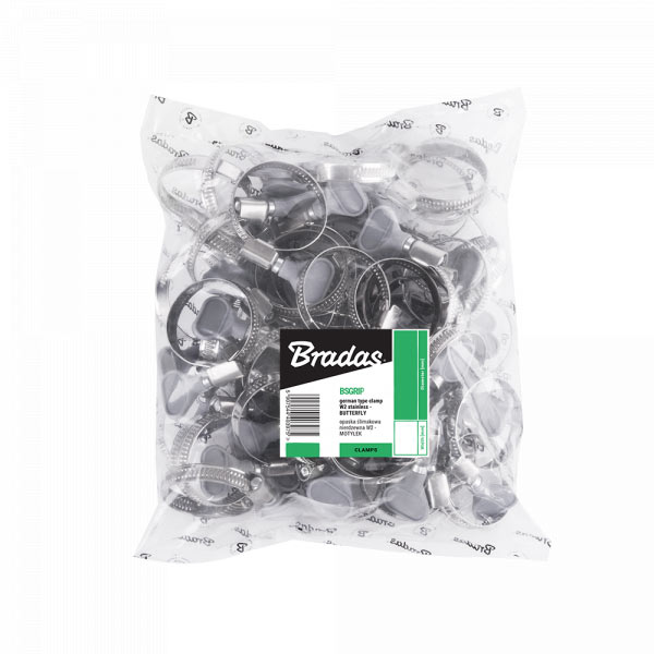 Хомут черв'ячний нержавіючий BRADAS із шириною стрічки 9 мм виготовлений із високоякісної нержавіючої сталі W2 відповідно до норм ISO 9001.Хомут черв'ячний нержавіючий BRADAS, з метеликом, 30-45мм, BSGRIP 30-45/9L