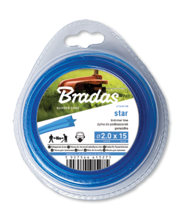 Нейлонова волосінь до тримера з п'ятикутним перетином (зірка). Має високу різальну здатність завдяки гострим граням. Підходить для скошування як м'якої молодої, так і густих заростей перестиглої грубої трави, добре справляється зі скошуванням сухої трави, товстостеблих рослин та молодої порослі кущів.Волосінь з зіркоподібним перетином створює менше шуму при роботі.