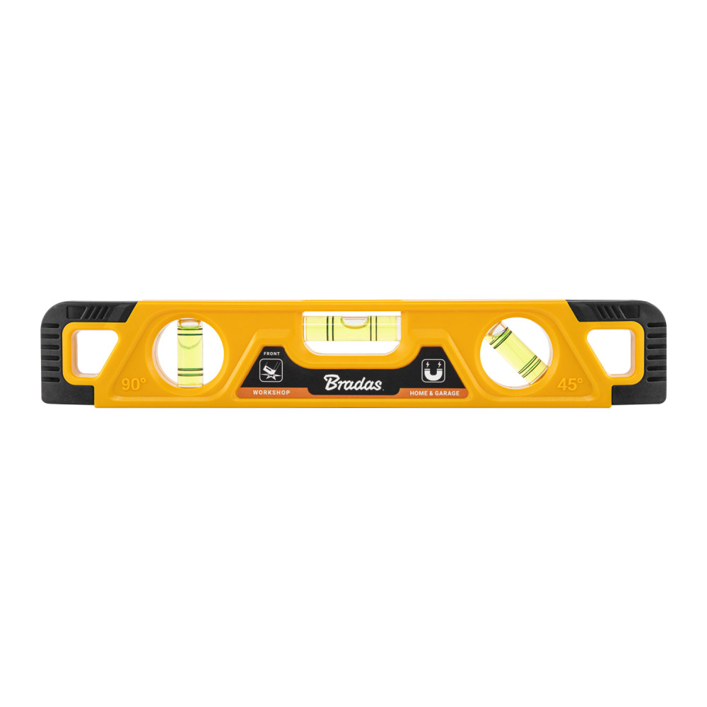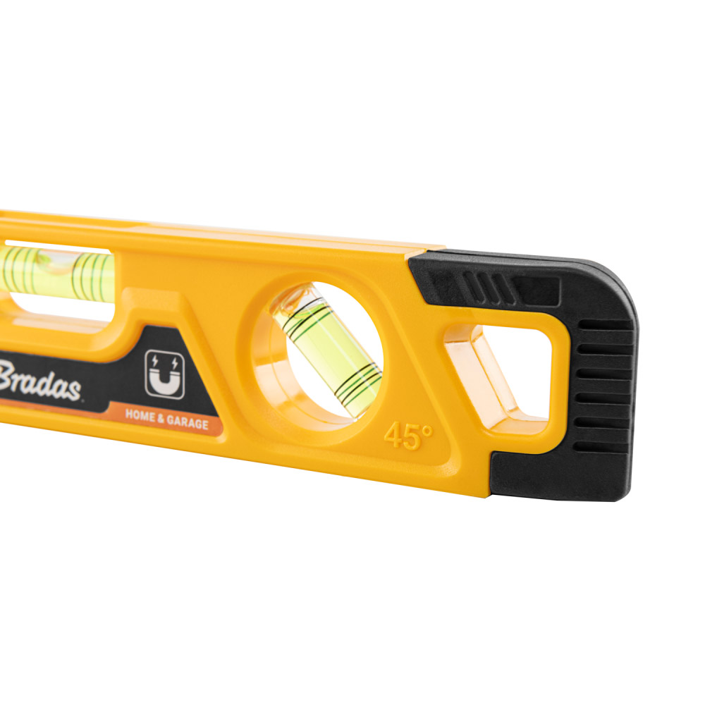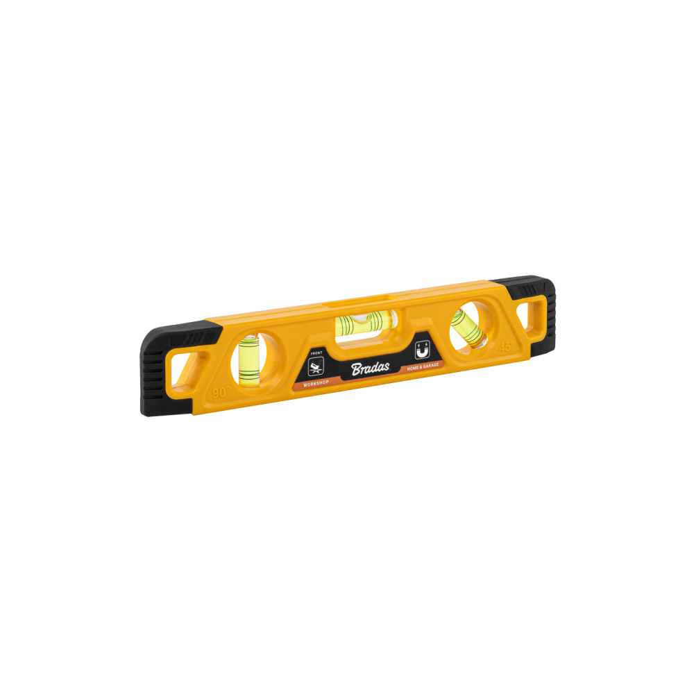 Рівень з магнітами — це точний, міцний і легкий вимірювальний прилад довжиною 23 см, що гарантує точність 1:1000 мм. Конструкція з нижньою канавкою забезпечує краще прилягання і більш точне вимірювання, а магнітна основа дозволяє зручно кріпитися до металевих поверхонь. Ідеально підходить для вимірювань у трьох положеннях: горизонтальному, вертикальному та під кутом 45°, що забезпечує універсальність застосування.Технічні характеристики