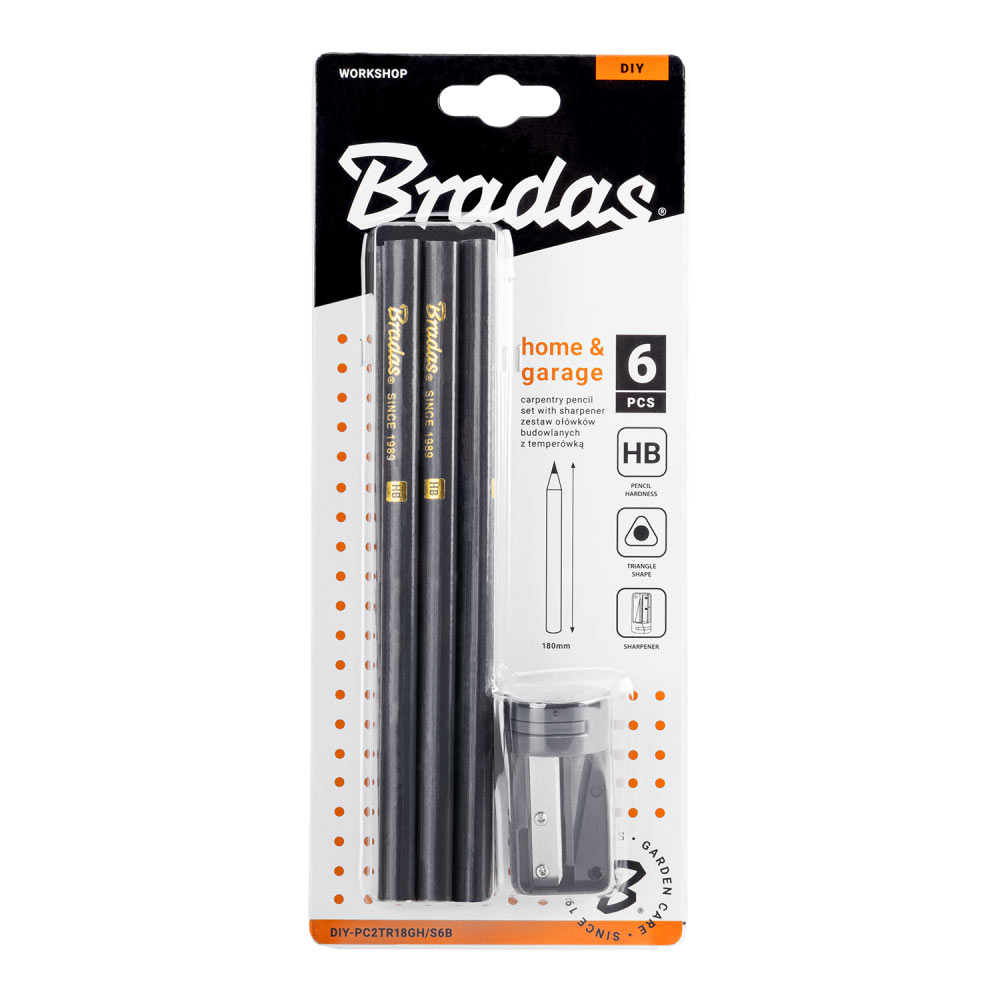 Використовується в столярній справі, а також у будівництві. Включає універсальну точилку для олівців різного перетину. Виготовлені з твердої деревини. Використовується для позначення міток, розмірів і малювання різних фігур.Набір будівельних олівців з точилкою HB TRIANGLE, 180мм, 6 шт., графітовий, DIY-PC2TR18GH/S6B
