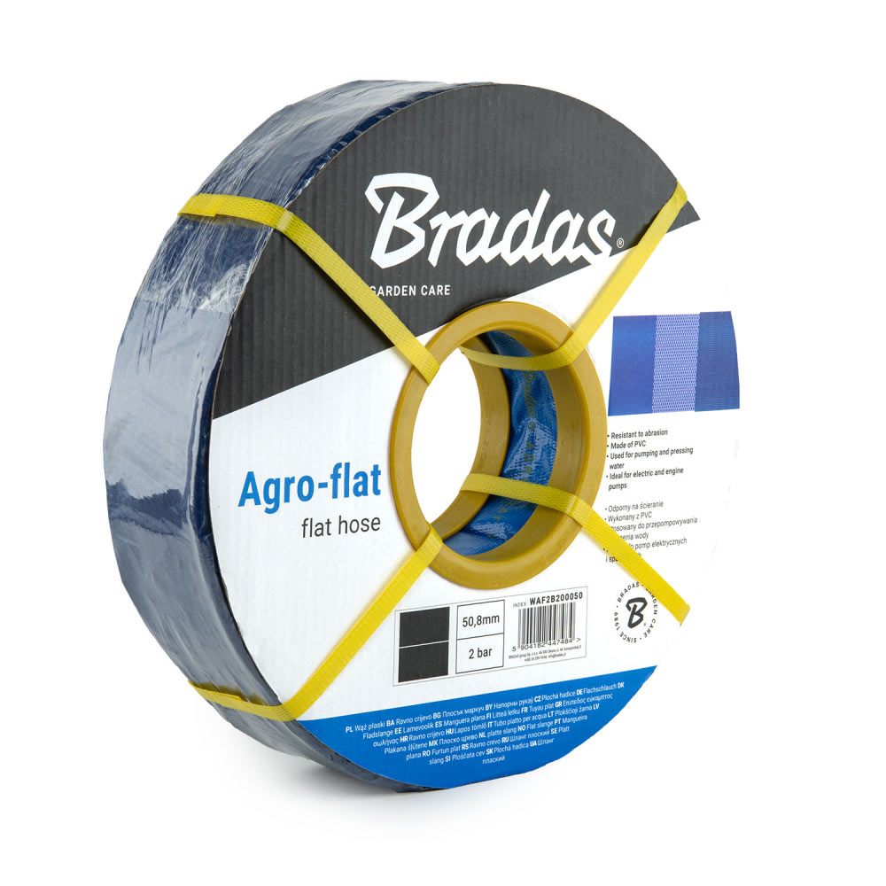 AGRO-FLAT — гнучкий плаский шланг на 2 BAR. Характеризується легкою вагою, високою зносостійкість, а також стійкістю до негативного впливу UV випромінювання. Шланг вкритий м'яким ПВХ, що робить його більш стійким до перепадів температури.Застосування: