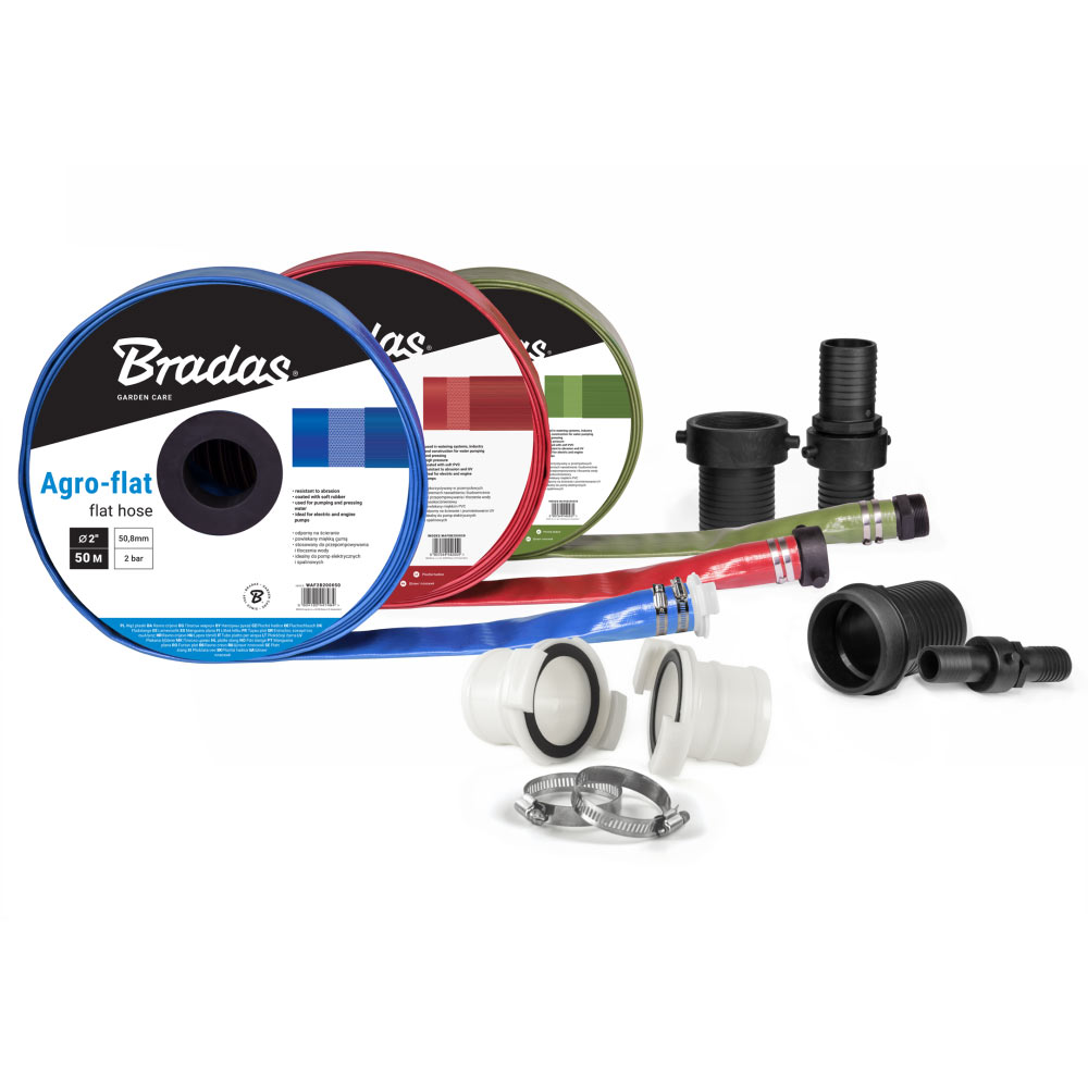 AGRO-FLAT — гнучкий плаский шланг на 2 BAR. Характеризується легкою вагою, високою зносостійкість, а також стійкістю до негативного впливу UV випромінювання. Шланг вкритий м'яким ПВХ, що робить його більш стійким до перепадів температури.Застосування: