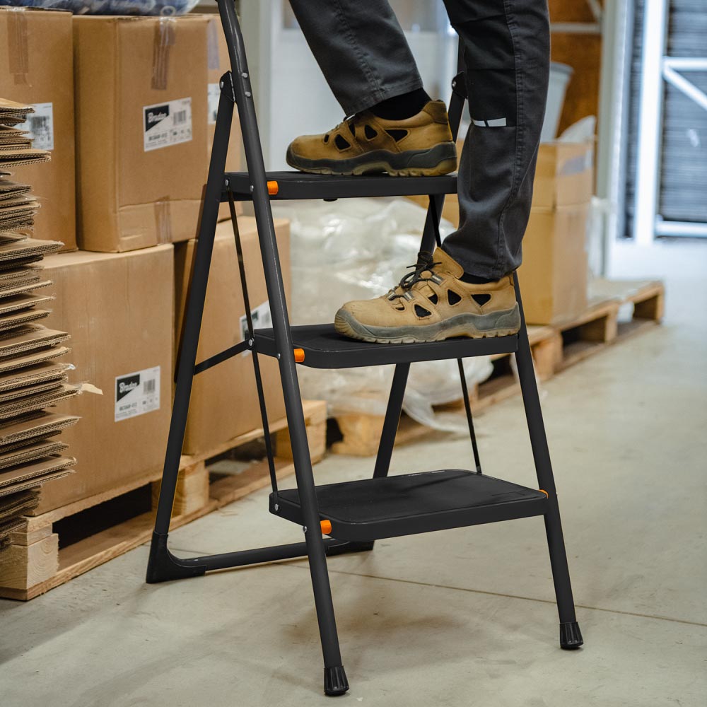 Складна сталева драбина — незамінний інструмент для кожного будинку, майстерні та офісу — стабільність, зручність та безпека роботи на висоті завжди під рукою. Компактна конструкція забезпечує легке зберігання та простий транспорт, що дозволяє заощадити місце там, де кожна дюйм простору на рахунку.Складна драбина 3 сходинки, висота останньої сходинки 73 см, DIY-LD01/3