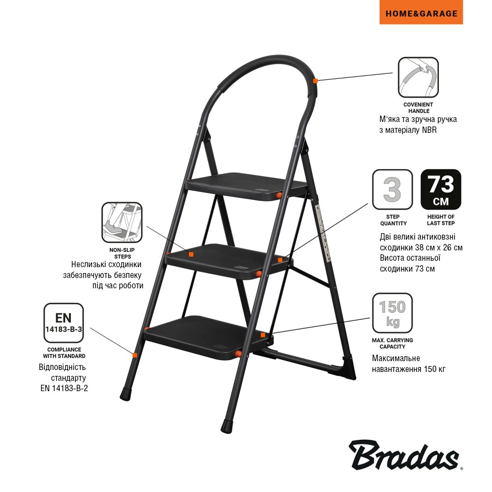 Складна драбина 3 сходинки, висота останньої сходинки 73 см, DIY-LD01/3
