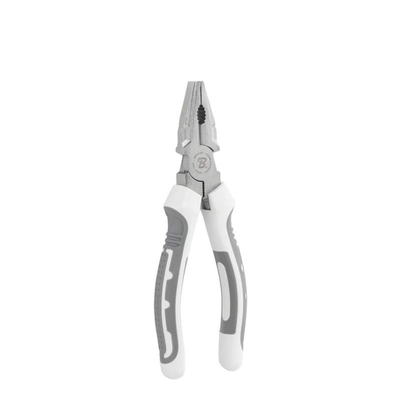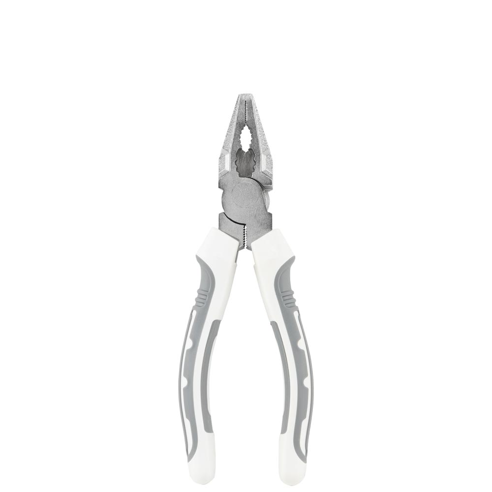 Виготовлені з вуглецевої сталі. Ергономічні та нековзні ручки. Зубчаста поверхня захвату. Застосування: монтажні, ремонтні та хобі роботи. Придатні для різання та формування дроту. Довжина: 160 мм.Універсальні плоскогубці PRO 160 мм, нікельовані, WHITE LINE, DIY-PLWL1310/6
