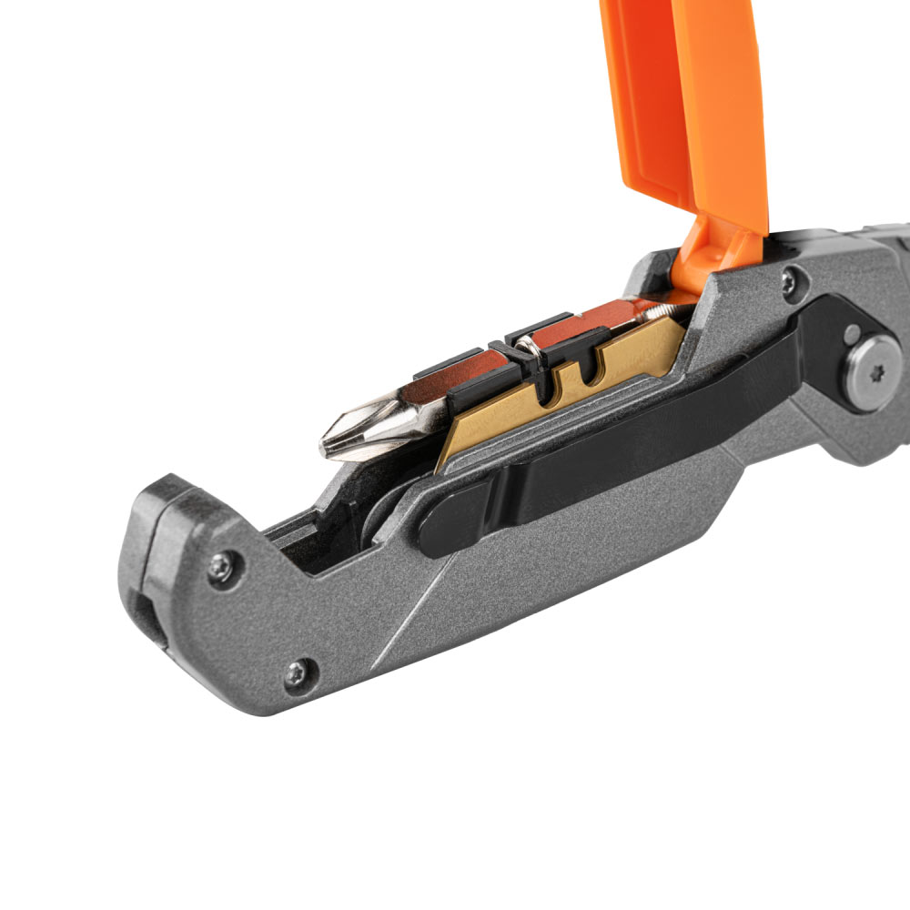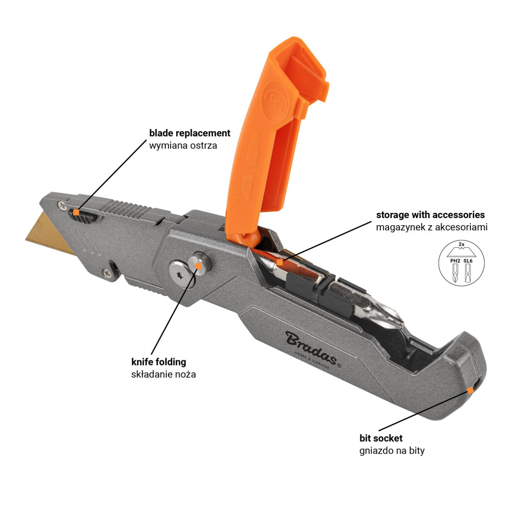 Лезо виготовлено зі сталі SK5, покрито захисним покриттям. Складаний ніж із блокуванням леза під кутом 180 градусів, 135 градусів, 90 градусів. Має функцію різання шнурів і ременів. На кінці ручки знаходиться магнітне гніздо для біт. Кріплення на корпусі дозволяє прикріпити ніж до ременя. Має магазин для змінних лез і біт. Металевий корпус виготовлений зі сталі. У комплекті два біти: SL6 і PH, а також трапецієподібні леза 19 мм (1+2 шт.)Універсальний складаний ніж METAL, лезо 19 мм, DIY-KN190202/B