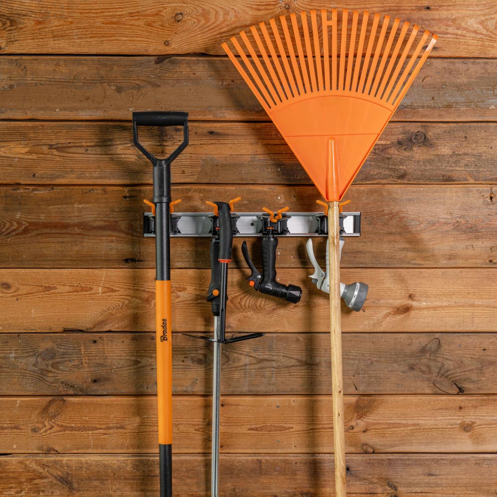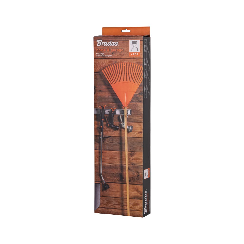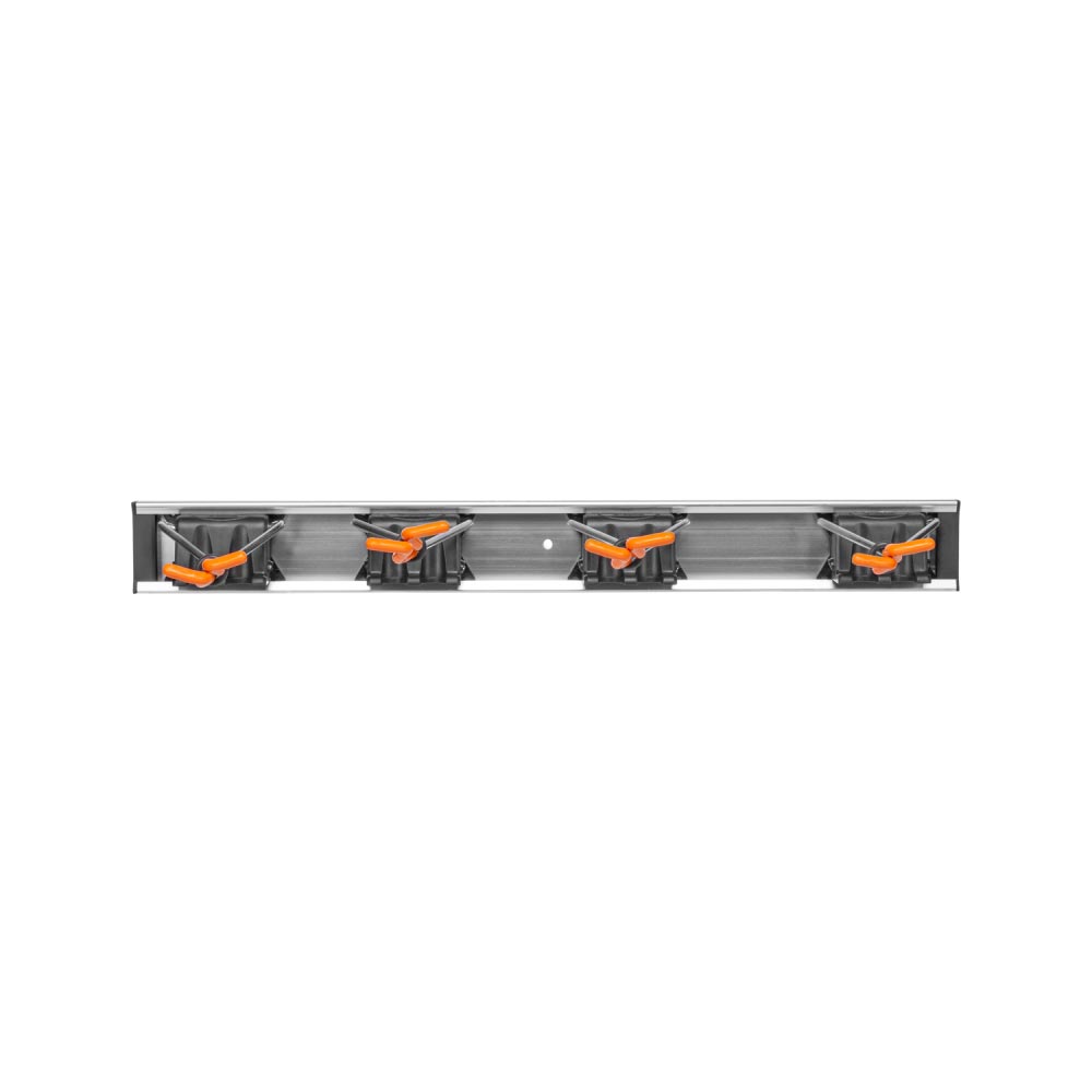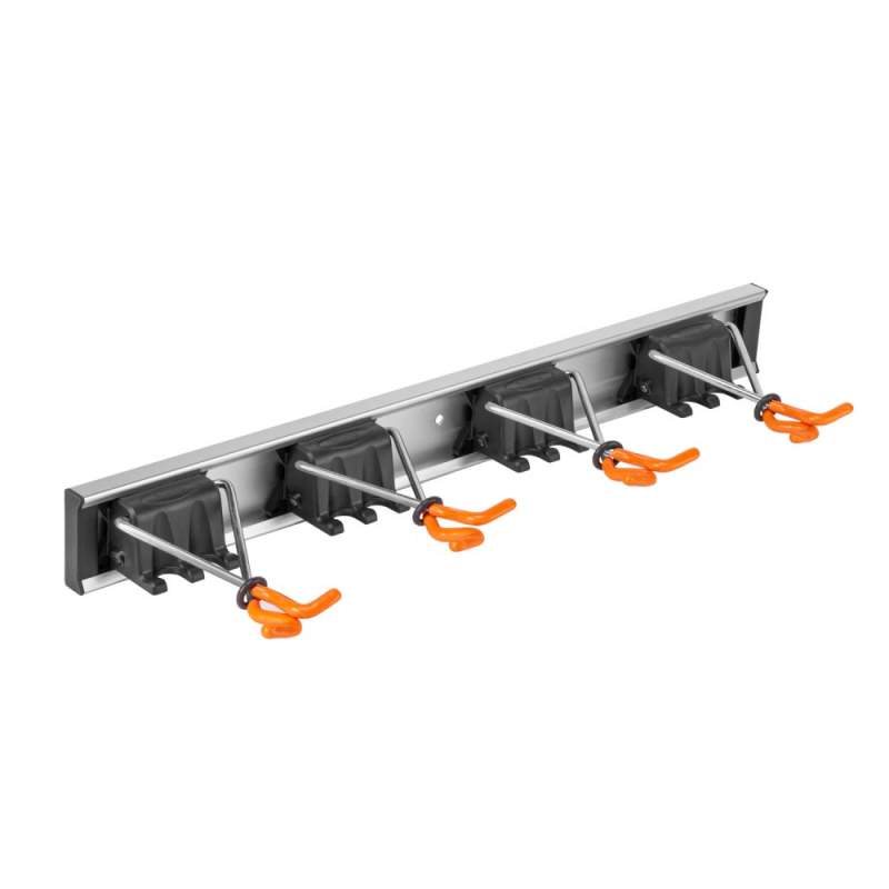 Алюмінієва рейка довжиною 50 см. Кожна вішалка має два додаткові кріплення, що дозволяють повісити аксесуари для поливу, закінчені ніпелем. Основа з ABS і гак з високоякісної сталі, покритої ПВХ. Призначений для інструментів діаметром 15-30 мм. Максимальне навантаження на один вішак: 2,5 кг.Вішалка для інструментів 4 кріплення / 8 кріплень під ніпель, DIY-HG1711