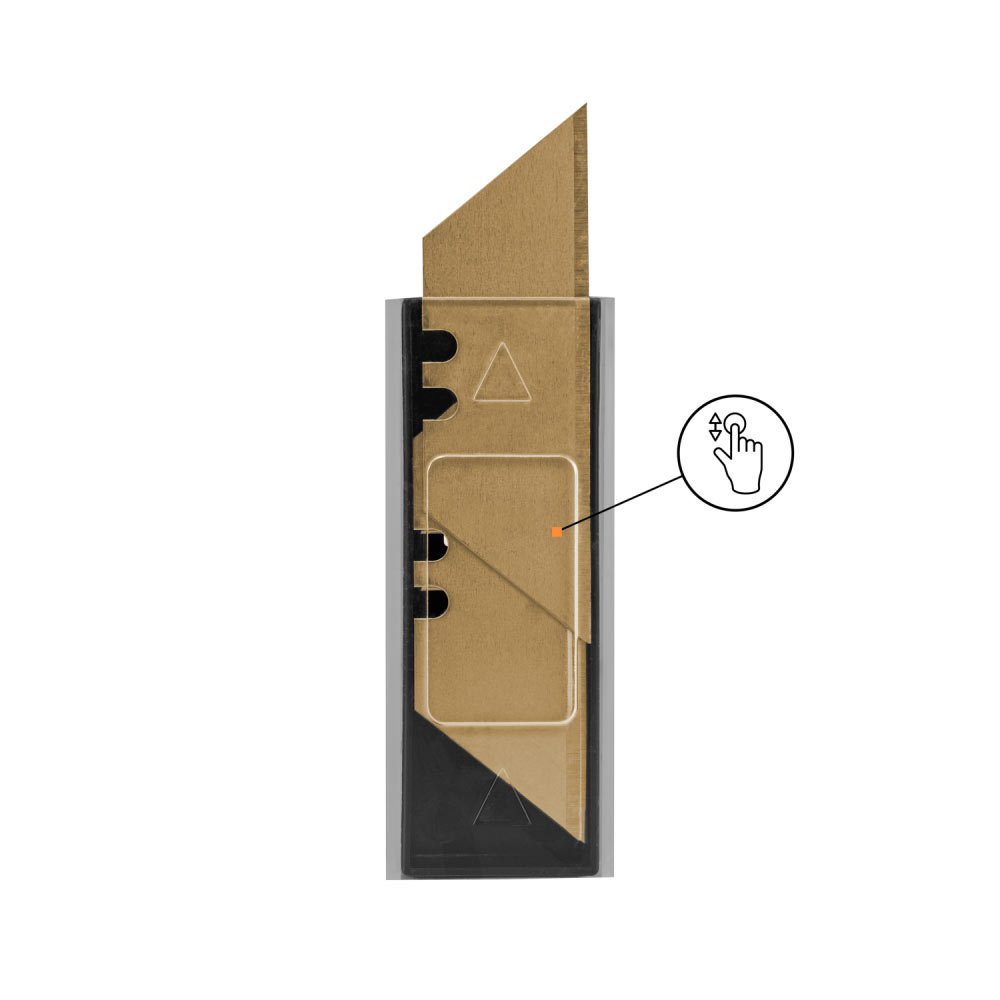 Трапецієподібні леза виготовлені зі сталі SK2, покриті захисним покриттям. Леза розміщені в подавачі, що полегшує зберігання та безпечне виймання окремих лез.Змінні трапецієподібні леза 19 мм, GOLDL, 10 штук, DIY-KN1902BG/10B